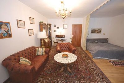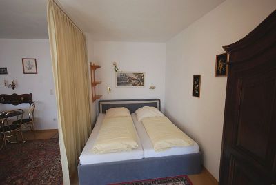 Der Wohn- und Schlafbereich befindet sich in einem Raum und ist mit einem Teppichboden ausgelegt. Der Wohnbereich besteht aus einer Polstergruppe einem stilvollen Wohnzimmerschrank und einem Esstisch mit drei Stühlen. Der etwas abgesetzte Schlafbereich besteht aus einem Doppelbett mit Federkernmatratzen und Lattenrosten und einem Kleiderschrank. Aus Platzgründen befindet sich das Doppelbett in einer Raumecke, was den Einstieg der 2. Person etwas beeinträchtigt. Der separate Küchenraum verfügt über eine Einbauküche und ist mit Kaffeemaschine, Toaster, Mikrowellenherd und allen gebräuchlichen Haushaltsutensilien ausgestattet.