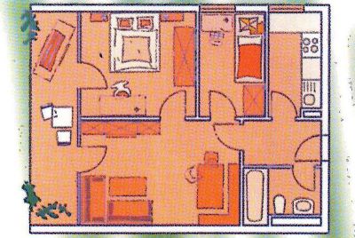 Die Drei-Raum Wohnung mit ca. 55 qm liegt im 2. OG verfügt über eine Gartenterrasse und ist nach Westen ausgerichtet. Das Wohnzimmer ist mit einer Polstergruppe, mit einer Wohnschrankwand und einer Esstischgruppe möbliert. Alle Räume sind mit einem allergikerfreundlichen Laminatboden ausgelegt. Die Wohnung bietet Platz für 2 bis 4 Personen und ist geschmackvoll und komfortabel ausgestattet.