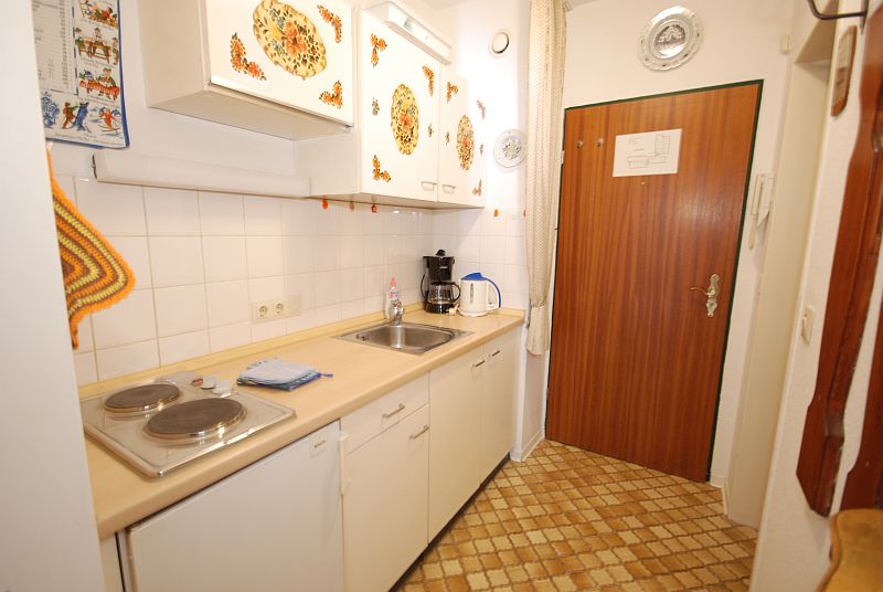 The kitchenette is integrated in the hallway and equipped with an electric stove, coffee maker, toaster and all conventional cooking utensils. A landline telephone is installed.